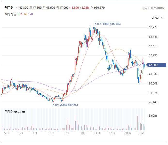 주가 전망 및 분석: 테라다인 장비가 많이 팔릴수록 테크윙의 핸들러 수요도 동반 상승합니다. 전형적인 낙수효과의 수혜주로 꼽힙니다.