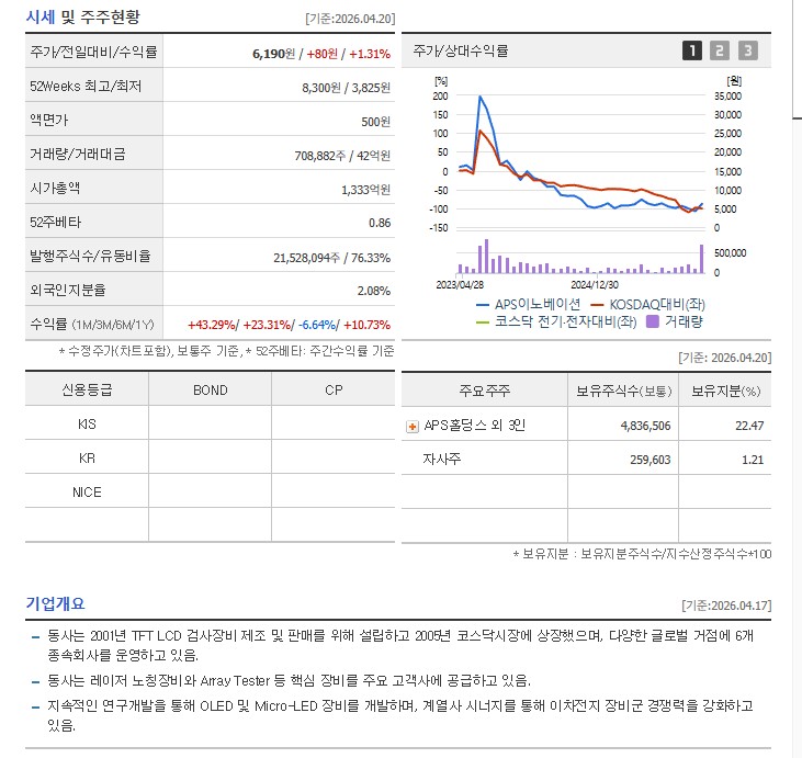최대주주는 APS홀딩스로, 안정적인 지배구조를 바탕으로 책임 경영을 실천하고 있습니다. 재무적으로는 전방 산업의 투자 위축으로 다소 부침이 있었으나, 최근 OLED 설비 투자 재개와 북미향 이차전지 장비 수주 기대감이 높아지면서 재무 건전성 회복이 기대되는 상황입니다. 특히 매출원가 절감을 위한 자동화 공정 도입이 가시적인 성과를 내고 있습니다.