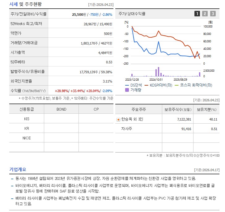 1965년 설립된 노루표화학에 뿌리를 둔 DS단석은 반세기가 넘는 시간 동안 정밀화학 분야에서 기술력을 쌓아왔습니다. 현재는 '지속 가능한 미래'를 슬로건으로 내걸고, 전 세계적인 탄소중립 트렌드에 맞춰 바이오 에너지와 자원 재활용 사업을 주력으로 영위하고 있습니다. 본사는 경기도 시흥에 위치하며, 평택과 군산 등에 대규모 생산 거점을 확보하고 있습니다.