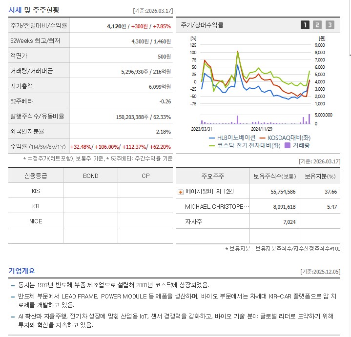 | HLB이노베이션 | 반도체 리드프레임 제조 및 CAR-T 세포치료제 신사업 |