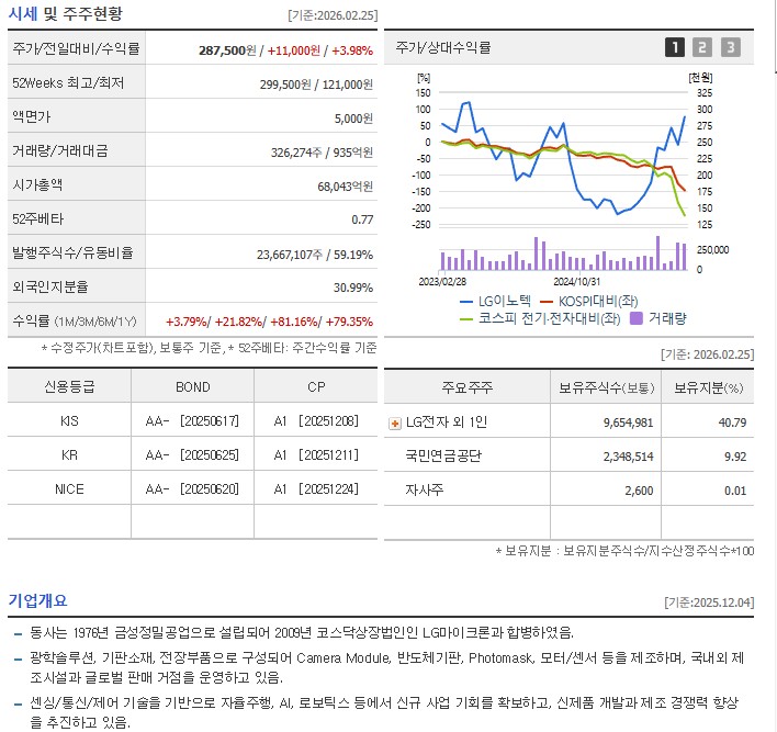 LG이노텍의 최대 주주는 LG전자로 약 40.79%의 지분을 보유하여 경영권을 안정적으로 유지하고 있습니다. 이외에도 국민연금공단이 주요 주주로 이름을 올리고 있어 기관 투자자들의 높은 신뢰를 받고 있는 종목임을 알 수 있습니다.