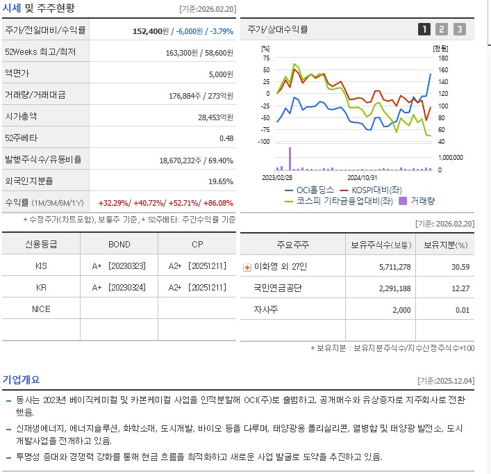 OCI홀딩스는 과거 동양화학공업으로 시작해 화학 산업의 외길을 걸어온 대한민국 대표 에너지 기업입니다. 현재는 지주회사 체제로 전환하여 태양광용 폴리실리콘을 중심으로 에너지 솔루션, 도시개발, 신재생에너지 사업을 영위하고 있습니다.